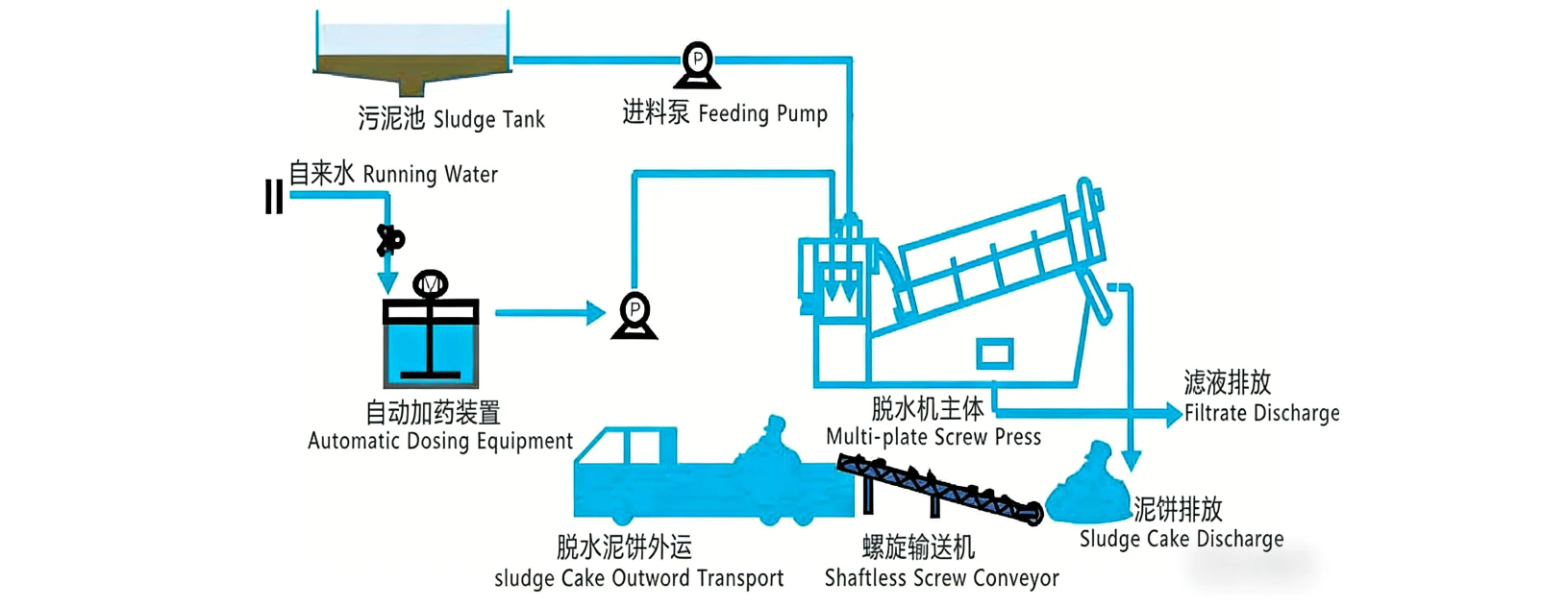 The operation of a screw press sludge dewatering machine involves several key steps: